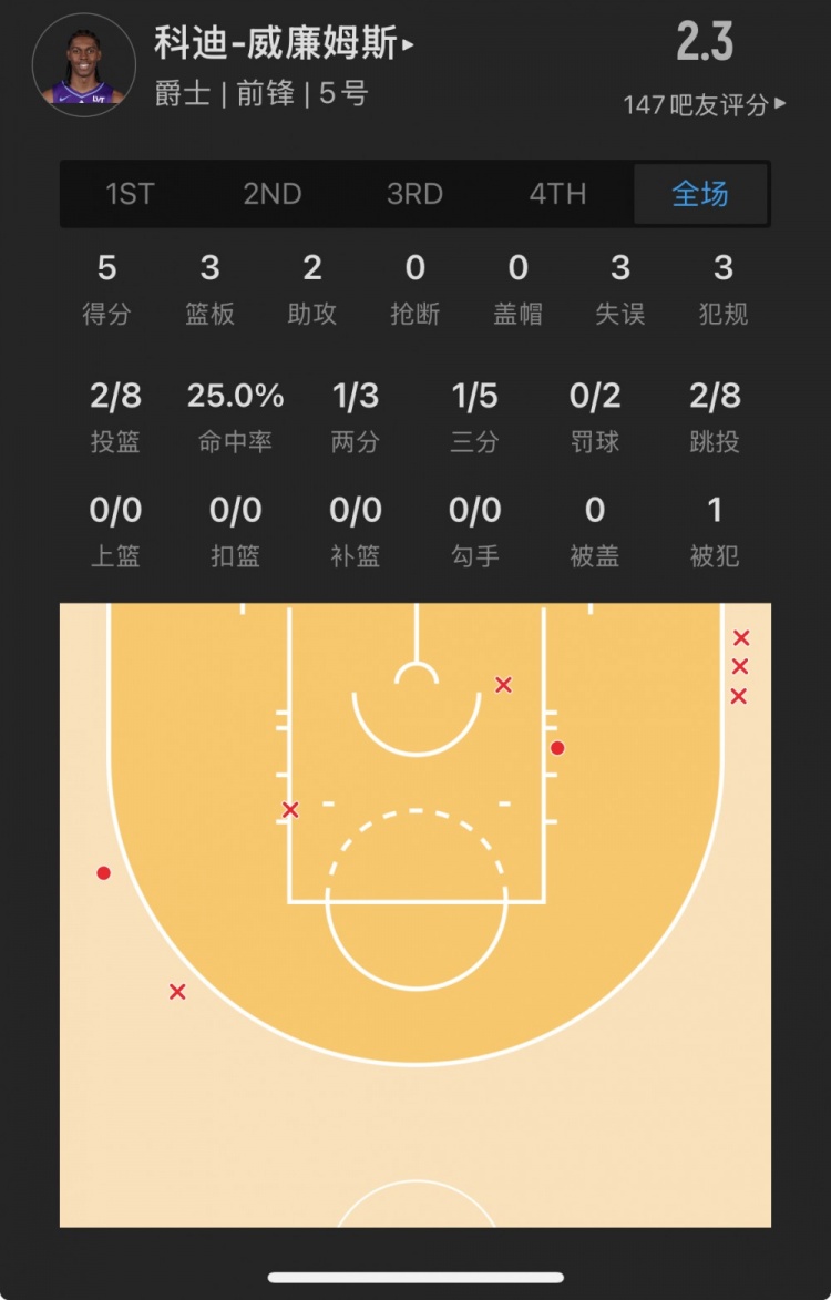 爵士10号秀 科迪-威廉姆斯 登场27.4分钟
