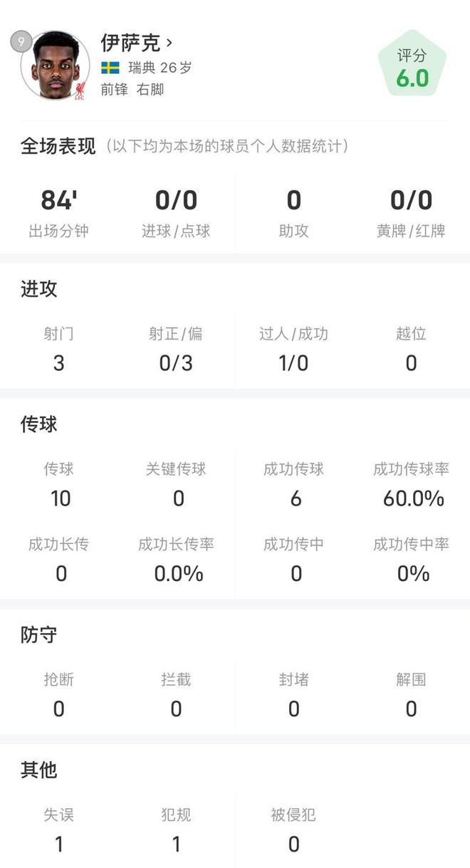 雷速体育9月28日讯 英超第6轮,利物浦客场1比2不敌水晶宫,利物浦前锋伊萨克首发出战84分钟。