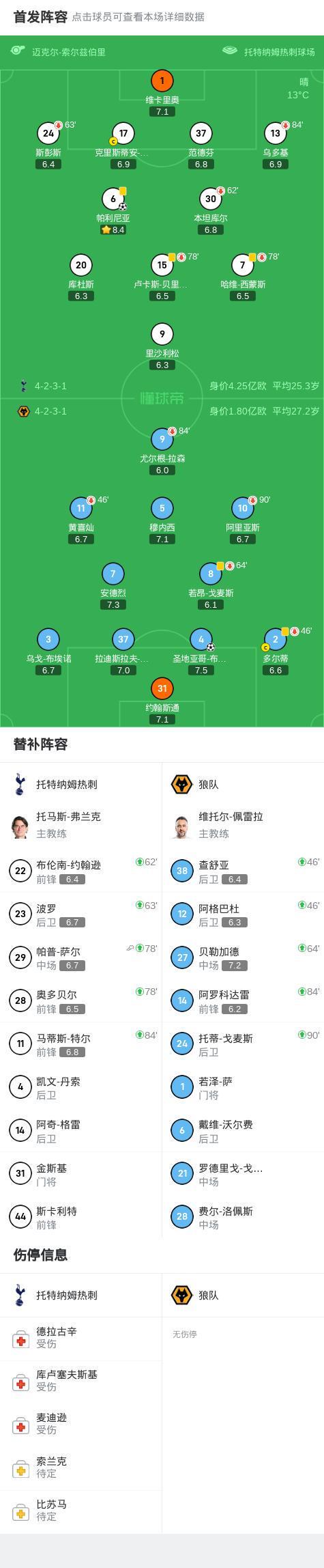 北京时间9月28日,英格兰足球超级联赛第6轮展开较量,托特纳姆热刺坐镇主场迎战狼队。上半场,库杜斯破门因越位在先被吹。下半场,圣地亚哥-布埃诺帮助狼队打破僵局。补时阶段,帕利尼亚完成绝平。全场比赛结束,热刺1-1狼队。