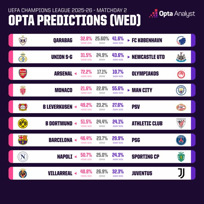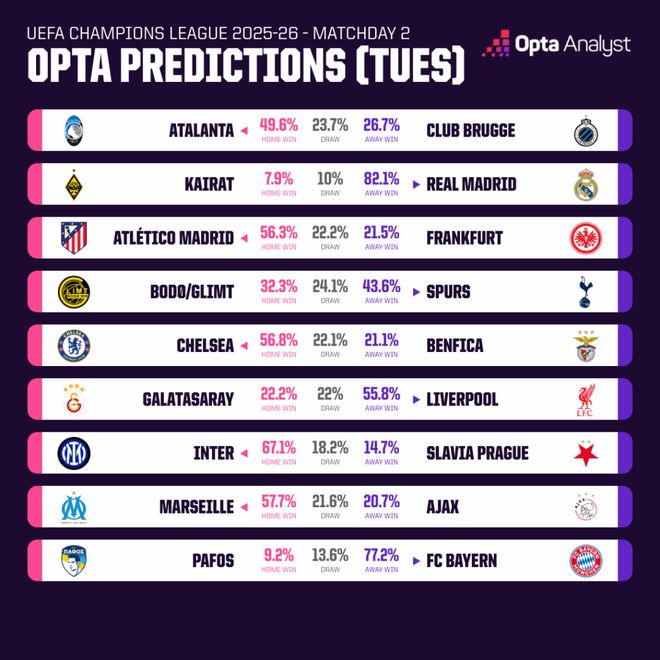 - 英超 | 202526欧冠第二轮:Opta预测全解析
