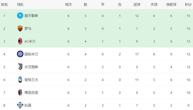 在积分榜,榜首易主了。那不勒斯5胜1负,拿到15分,排名榜首。罗马的战绩和那不勒斯一样,也是15分,但净胜球少,只能排名第2。AC米兰以13分排名第3。国际米兰12分,排名第4。尤文图斯也是12分,净胜球太少,排名第5。亚特兰大和博洛尼亚都是10个积分。