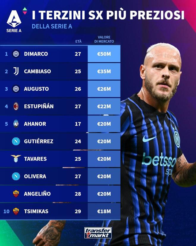 德转列意甲左后卫身价:迪马尔科5000万欧居首,坎比亚索第二