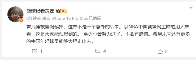 - NBA | 媒体人:曾凡博被裁不意外,希望年轻球员大胆走出去