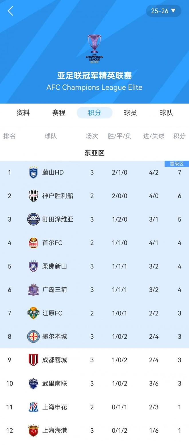 - 中超 | 亚冠精英赛最新积分榜:中超2队均输球,上港垫底,2队3轮不败