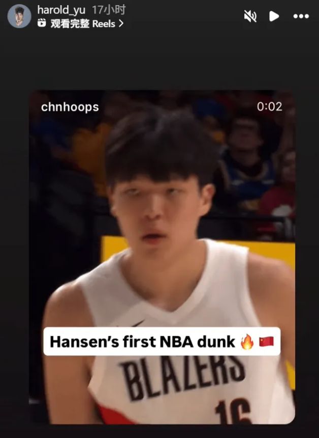 当杨瀚森完成NBA生涯第一次运动战得分,也是首个扣篮之后,正在西乙打球的余嘉豪转发了这个视频,没想到就在当天,他就打出了来到西乙之后的最强一战。或许因为是同在国外,又或许都是大中锋的缘故,当杨瀚森完成NBA生涯首个扣篮的时候,余嘉豪赶紧进行了转发。