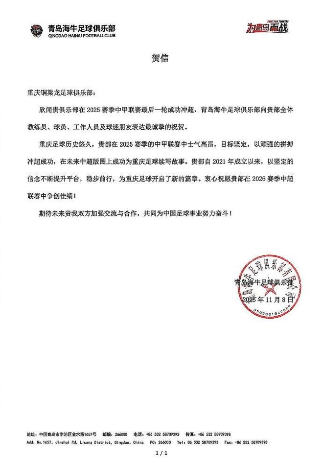 欣闻贵俱乐部在 2025 赛季中甲联赛最后一轮成功冲超,青岛海牛足球俱乐部向贵部全体教练员、球员、工作人员及球迷朋友表达最诚挚的祝贺。