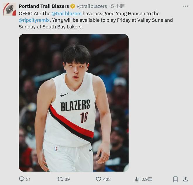 - NBA | 开拓者官宣:杨瀚森被下放到发展联盟,周六就要参加比赛!