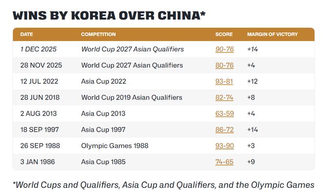 14分是近年来韩国队赢中国男篮的最大分差/图片来源:FIBA官网事实上,中国队前不久刚赢过韩国队。今年亚洲杯四分之一决赛中,中国队以79:71击败对手,时隔10年再度打入亚洲杯四强。单从牌面来看,韩国篮球队并不像拥有孙兴慜、李刚仁的韩国男子足球队那样群星璀璨。韩国男篮的当家球星是李贤重,他有着长时间的海外征战经验,曾在澳大利亚随伊拉瓦拉老鹰队夺得了2024–2025赛季NBL总冠军,也是他在五棵松投进了9记三分。李贤重是韩国队比赛中最大的亮点,他体现着亚洲球员走出舒适圈,外出比赛、学习带来的积极效果。与之相比,征战NCAA中国选手王俊杰在亚洲杯期间表现不俗,只不过此次由于赛程原因他并未回国比赛。