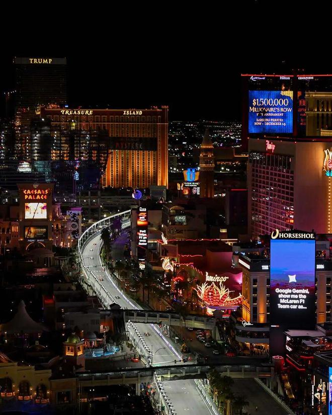 这是唯一的夜间赛道,而且还是难度升级狭窄的城市道路,这个拉斯维加斯的夜晚,是赛车世界最不讲道理的舞台。