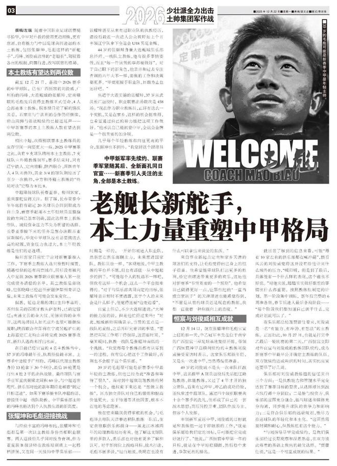 截至12月21日,备战中2026赛季的中甲球队,已有广西恒宸的刘俊威、广州豹的冯峰、大连鲲城的张耀坤、定南赣联的毛彪先后获得主教练正式任命,4人全部是本土教练。据本报目前了解的情况来看,石家庄与牛洪利的合作仍将继续,佛山南狮与张效瑞续约已接近尾声……中甲新赛季的本土主教练人数有望达到两位数。